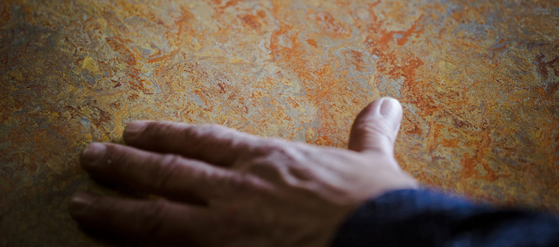 Überhaupt ist es Thomas Tigges wichtig, dass die von seinem Unternehmen angebotenen Baustoffe hohe Umweltstandards erfüllen und sich zugleich durch Langlebigkeit und gutes Design auszeichnen. „Nehmen Sie zum Beispiel die Gutshofdielen, die wir von einem Hersteller aus dem Sauerland beziehen“, sagt Tigges, und zeigt auf ein Produktmuster aus dunkelbraunem Holz. „Diese Dielen aus Eiche, Buche, Ahorn und anderen heimischen Hölzern sind ausgesprochen schön, tragen zu einer angenehmen Wohnatmosphäre bei und stammen aus einer nachhaltigen Produktion. Das gleiche gilt für die traditionell hergestellten Terrazzo- und Mosaikplatten von VIA. Die sich übrigens sehr schön mit Holzdielen kombinieren lassen“, freut sich Tigges. „Wir beraten unsere Kunden umfassend und ganzheitlich. Dabei geht es natürlich um Gesundheit und Umwelt, aber ebenso um die geplante Raumnutzung und das passende Design. Je nachdem, was jemand wirklich braucht, empfehlen wir dann zum Beispiel einen Linoleumboden, einen Tretford-Teppich, Gutshofdielen oder Fertigparkett.“