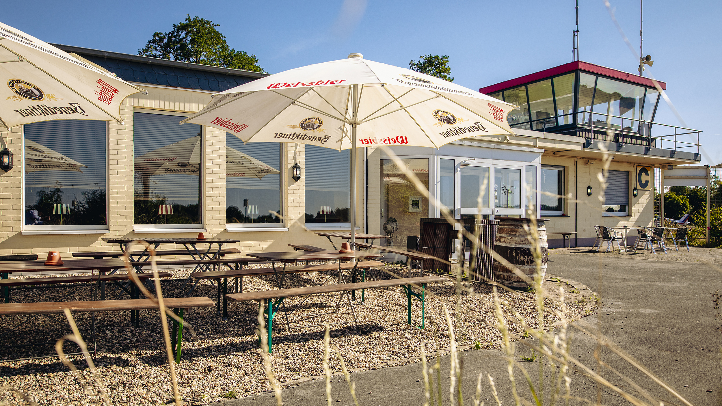 Getreu nach dem Motto „Einfaches gut machen“, betreiben Jo Brauwers und Malte Arndt die beliebte Gastronomie direkt am Flugplatz jetzt seit drei Jahren. Von Beginn an lag für den gelernten Koch und Betriebswirt Arndt der Fokus auf einer Küche mit regionalen Spezialitäten: „Wir möchten unseren Gästen Klassiker wie Frikadellen und Pommes, aber auch leckere selbst gebackene Kuchen zu einem guten Preis-Leistungs-Verhältnis anbieten“, erklärt der Geschäftsführer der Gastronomie. Die Snack-Bar im Außenbereich wurde in den letzten drei Jahren bereits sehr gut angenommen. Nach einem Spaziergang oder einer Fahrradtour am idyllisch gelegenen Egelsberg kehren Ausflügler gern für einen Snack in den Biergarten ein, der seit Kurzem durch die Anschaffung einer großen Doppelmarkise auch viele Schattenplätze und einen Regenschutz bietet.