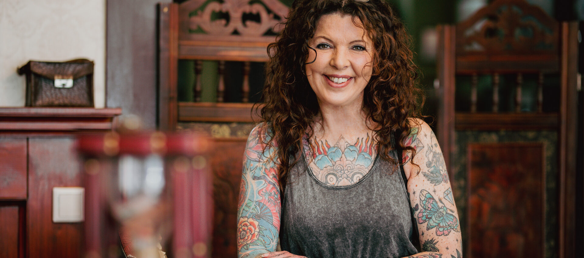 Als wir an diesem Montag das oldschool angehauchte Studio „Just Ink“ an der Sternstraße betreten, überwältigt uns eine Flut von Bildern an den grün gestrichenen Wänden. Porträts, Landschaften und gerahmte Tattoomotive lassen die Augen wandern. „Die habe ich über Jahre hinweg auf Flohmärkten gesammelt“, erklärt uns Inhaberin Susanne Swillens den Zweck mit hörbarem Stolz. „Wer sich von uns ein Tattoo stechen lässt, verbringt schließlich wertvolle Zeit im Studio. Die Dekoration schafft nicht nur eine angenehme Atmosphäre, sondern ist auch mit einem nicht ganz ernst gemeinten Suchauftrag verbunden. Denn ein Bild ist zufällig doppelt vorhanden.“ Wir finden es nicht auf Anhieb.
