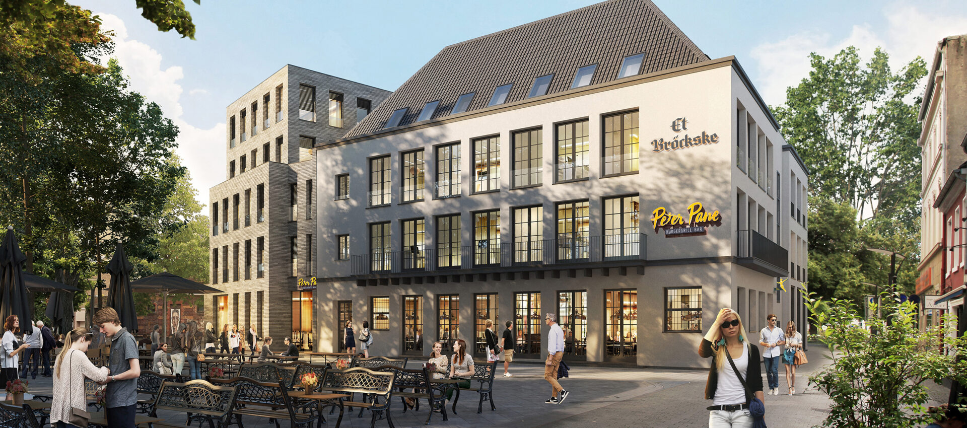 „Wir waren von Anfang an begeistert von diesem besonderen Gebäude“, schwärmt Arne Grundmann, Projektentwickler des Kölner Unternehmens qvadrat. „Da war zum einen diese charakteristische, denkmalgeschützte Fassade, zum anderen die lange Tradition des geschichtsträchtigen Ortes. In zahlreichen Gesprächen erfuhren wir, welche Bedeutung das Bröckske für viele Krefelder einnahm, welche Geschichten sie damit verbanden. Diesen Erinnerungen wollten wir unbedingt gerecht werden. Wir wollten sie revitalisieren und zu neuem Leben erwecken.“ Tatsächlich erinnerte das beinahe 15 Jahre lang leerstehende, langsam verfallende Gebäude mitten im Zentrum jeden Einwohner der Stadt schmerzhaft an bessere Zeiten. Die Rhenania Brauerei braute hier einst ihr Bier und schenkte es an ihre durstigen Gäste aus. Auch nach dem Umzug der Brauerei, der Zerstörung und dem Wiederaufbau im Zweiten Weltkrieg erfreute sich das Lokal viele Jahrzehnte großer Beliebtheit. Bis in die 2000er galt das urige Gasthaus insgeheim als „Stube der Stadt“, wo man sich austauschte, feierte und lachte. Dann begann der langsame Niedergang, bis die Pforten 2009 endgültig geschlossen wurden und das Gebäude zusehends verfiel. Die Lücke, die das „Et Bröckske“ als gutbürgerliches Brauhaus und Treffpunkt für Jedermann in Krefeld hinterließ, klaffte tief.