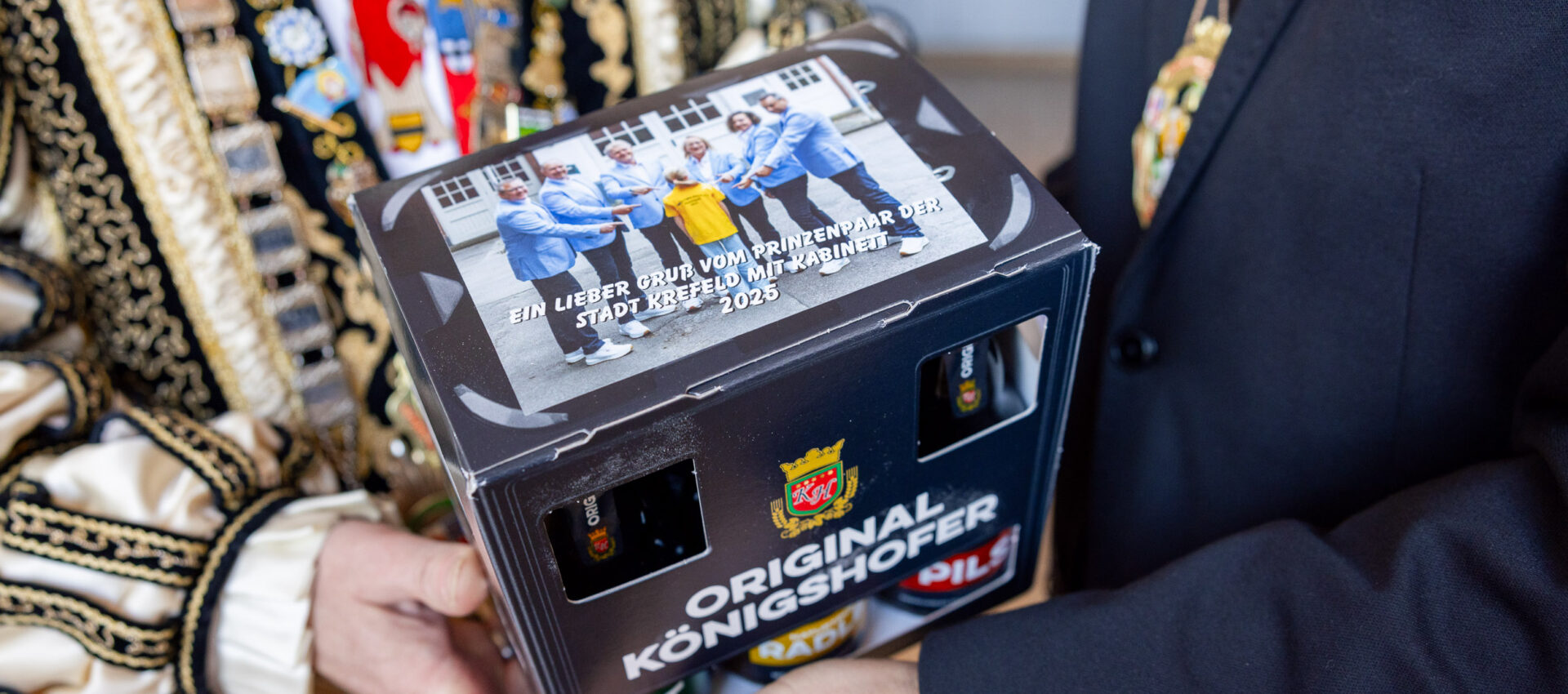 Zum ersten Mal in der Geschichte des hiesigen Karnevals gibt es 2025 ein Gastgeschenk, mit dem sich Peter und Andrea für zahlreiche Einladungen bei Vereinen, Institutionen oder Seniorenheimen bedanken wollen. Die Idee entwickelten Brauerei und Jecken gemeinsam: „Das Sixpack ist eine bunte Mischung – genau wie der Karneval. Insofern haben wir auch ein obergäriges Bier dabei“, sagt Frank lachend und stellt die farbenfrohe Box mit sechs Bügelflaschen auf den Holztisch. Während Prinzessin Andrea III. mit ruhiger Stimme auf den lebendigen Mix an großen und kleinen, alteingesessenen und neuen Karnevalsvereinen in der Stadt hinweist, wirft Ehemann Peter in breitestem Krieewelsch ein: „Dat Sixpack jibbet nich zu kaufen, dat kann man sich nur verdienen!“ Dieses Geschenk sei nicht mit Kamelle zu vergleichen, sondern eine herzliche Geste, da sind sich alle einig. Auch Oberstleutnant Schorsch, der als Adjutant des Prinzen heute still mit in der Runde sitzt, nickt zustimmend.