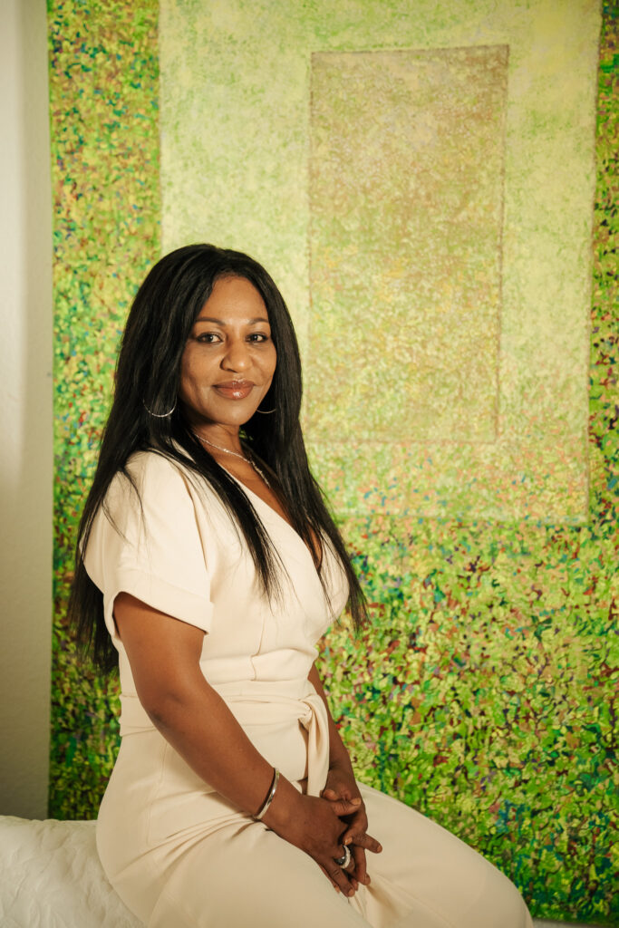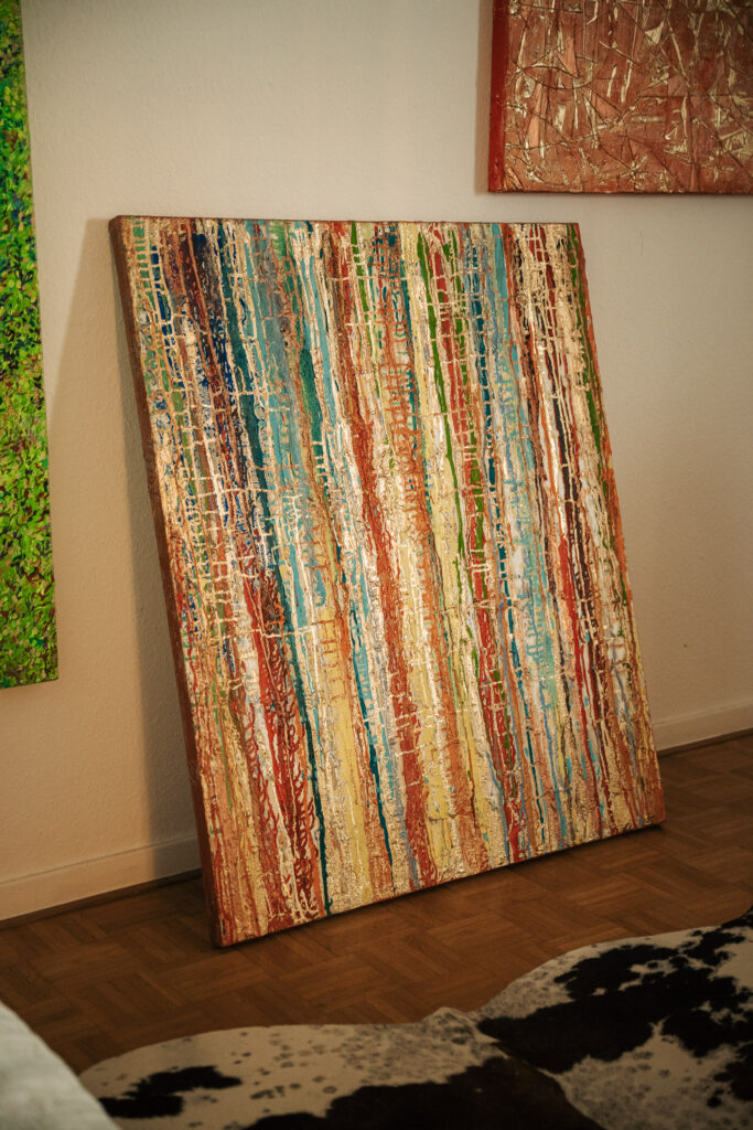 Unser Treffen beginnt mit Gegensätzen: Afrikanische Wurzeln treffen auf deutsche Pünktlichkeit, quirliges Innenstadtleben prallt auf ruhige Hinterhofatmosphäre, und schwarze Haare kontrastieren perfekt zum cremeweißen Hosenanzug. Durch das Atelier an der Stephanstraße fließt eine positive Energie, die bei den farbenfrohen Ölgemälden an den Wänden beginnt und sich bis zur offen-herzlichen Persönlichkeit von Adiam Hailesillassie durchzieht. „Ich bin 1974 in Tessenei im Westen Eritreas geboren, und meine Vergangenheit hat mich und meine Bilder sehr beeinflusst“, erzählt die Künstlerin gut gelaunt, während sie ohne Umschweife das Sofa ansteuert, um sich für unsere Fotos in Szene zu setzen. Dass eine von Kriegserfahrung, Flucht und Verlust von Familie geprägte Kindheit hinter ihr liegt, scheint dennoch nur zwischen den Zeilen durch. Die Jahre als Klosterschülerin in Italien und ihre tiefe Verbundenheit zu Gott haben offensichtlich dafür gesorgt, dass sie sich heute auf das Gute im Leben fokussieren kann. Diese Liebe und Kraft merkt man ihren großformatigen Werken mit Titeln wie „Tor zur Ewigkeit“ oder „Stadtwald“ durchaus an – sie sind lebendig, emotional und manchmal auch geheimnisvoll.
