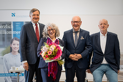 Von links nach rechts: Dr. Armin Knors (Hochschulratsvorsitzender), Prof. Dr. Susanne Meyer, Dr. Thomas Grünewald, Prof. Dr. Georg Oecking (Senatsvorsitzender der HSNR).