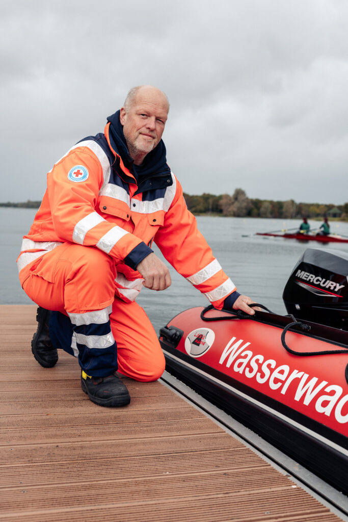 Die seit über 15 Jahren intensiv umgesetzte Jugendarbeit unter Leitung von Birgit Duhr trage gute Früchte, freut sich nicht nur Christiane Vieth. Von den kleinen Kids, die früh schwimmen und retten gelernt haben, sind mittlerweile sieben als volljährige Einsatzkräfte bei der Wasserwacht aktiv. Das sogenannte Schulbus-Projekt erleichtert den Übergang zu den Erwachsenen, so dürfen die Kinder der Jugendgruppe „Wasserwichtel“ von Anfang an das Material und die Boote der Großen ausprobieren. „Wenn die Kleinen Dienstkleidung tragen, wachsen sie sofort um 15 Zentimeter“, berichtet Christian Reuter freudestrahlend. „Die sind Feuer und Flamme und haben richtig Bock auf Rettungsdienst und blaue Lampen!“ Bei dieser Aussicht könne die fundierte Ausbildung der Standardhelfer wahrlich nicht abschrecken, wirft seine Kollegin ein. „Unsere kostenfreien Kurse wie ‚Erste Hilfe‘ oder ‚Verhalten in Krisensituationen‘ sind insgesamt auf zwei Jahre ausgelegt und daher gut vereinbar mit Beruf und Familie.“ Auch die Dienstkleidung im Wert von gut 600 Euro werde gestellt. Überhaupt sei man beim DRK off en für die individuellen Fähigkeiten der Ehrenamtler: Wer gern koche, sei genauso willkommen wie technikaffine Menschen, die als Drohnenpiloten die Personensuche auf Wasser unterstützen wollen.