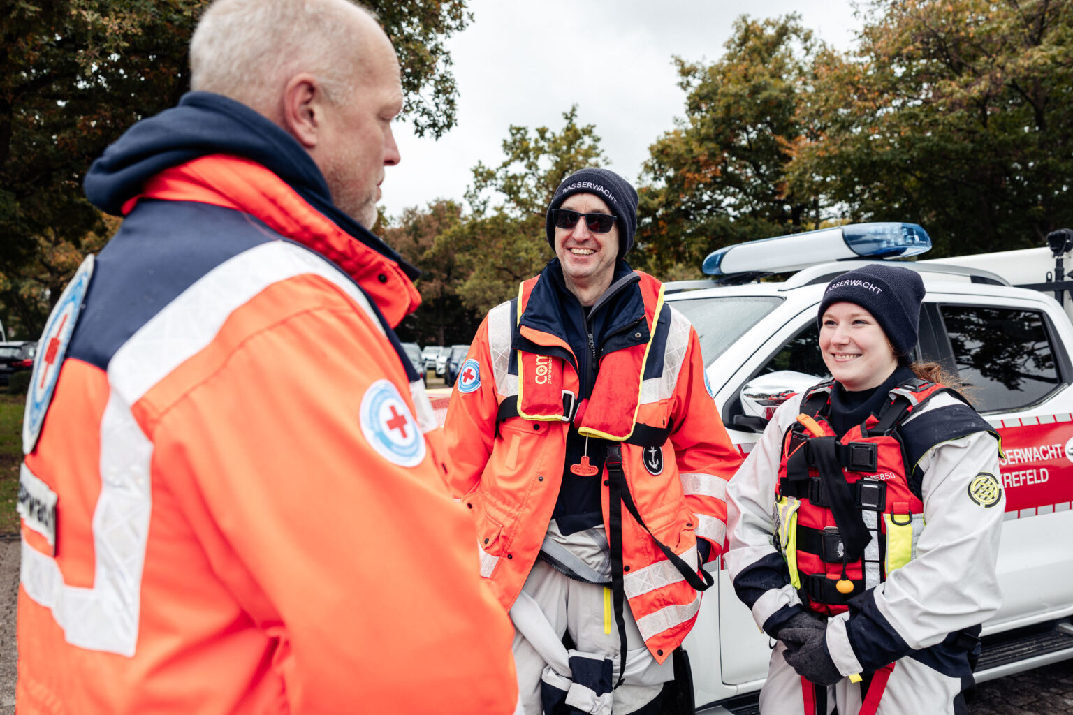 Blaues Licht, rote Jacken und irgendwas mit Wasser – so plakativ könnte man die ehrenamtliche Arbeit der Wasserretter vom DRK beschreiben. Wie vielseitig das Team um Leiter Christian Reuter tatsächlich eingesetzt wird, erfuhren wir im neuen Logistikzentrum für den Katastrophenschutz. Ob Elfrather See, Freibad oder Rhein – wenn Menschen in Not geraten, ist die Krefelder Wasserwacht mit Rettungsschwimmern, Booten und einem Rescue Water Craft (RWC) zur Stelle. Auch bei Hochwasser, Unwettern und Großveranstaltungen leisten die Helfer medizinische Erstversorgung und bringen Menschen in Sicherheit. Muss man unbedingt schwimmen können? Jein! Ein Gespräch über Gemeinschaft, Dankbarkeit und Suppe.