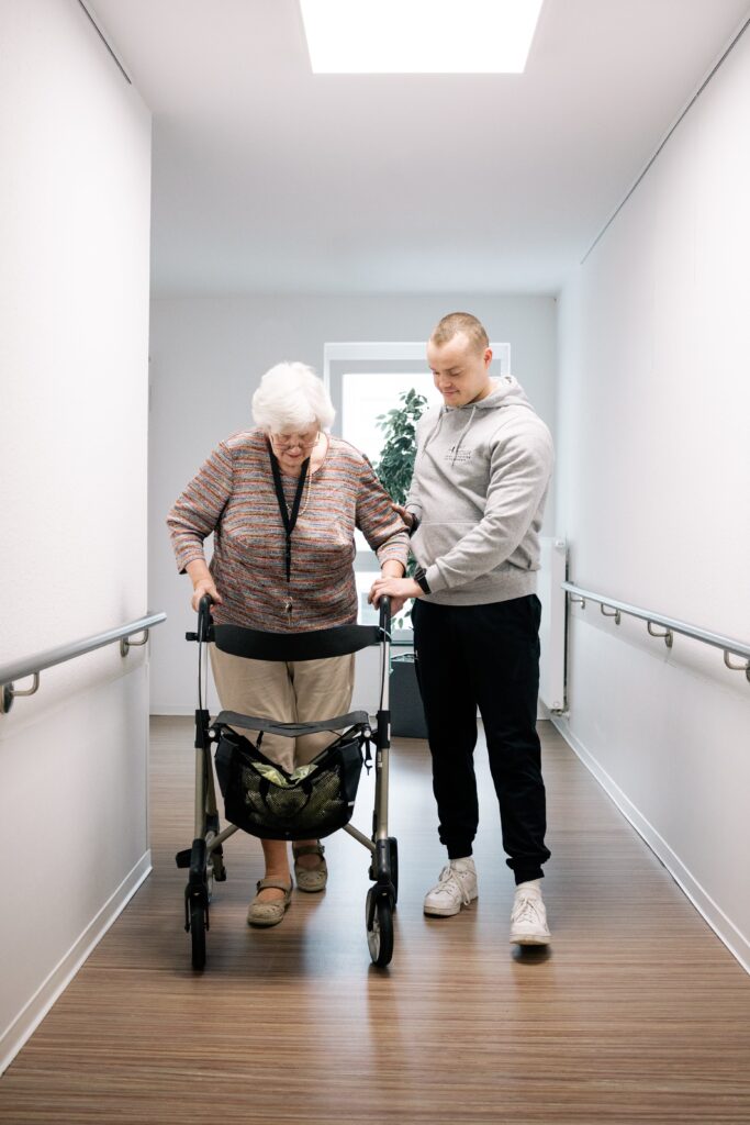 Bei der Lektüre des CREVELT Magazins vor einigen Monaten weckte der Artikel über den Personal Trainer Mike Heider ihre Neugier. Mike hat den Bachelor in Sportökonomie sowie die A-Lizenz als medizinischer Fitnesstrainer absolviert und wendet sich damit speziell an Seniorinnen und Senioren, die durch Erkrankungen, Unfälle oder normale Alterserscheinungen an Beweglichkeit eingebüßt haben und etwas für ihren Körper tun möchten. „Ich habe gedacht, dass er mir bestimmt helfen kann und habe ihn angerufen.“ Seitdem besucht Mike seine Kundin einmal in der Woche, um mit ihr eine Stunde lang zu trainieren. „Unser Ziel ist es, Frau Dreyer so viel Sicherheit zurückzugeben, dass sie sich im Heim allein mit dem Rollator bewegen kann. Und im Frühjahr möchten wir zusammen einen kleinen Spaziergang im Garten machen und die Sonne genießen!“, lächelt der Personal Trainer. Renate Dreyers Augen leuchten auf.