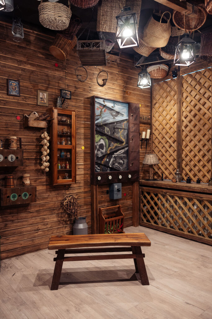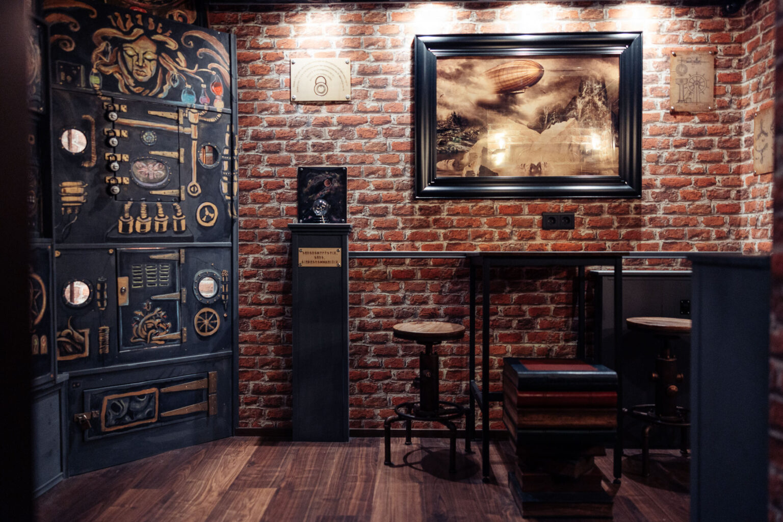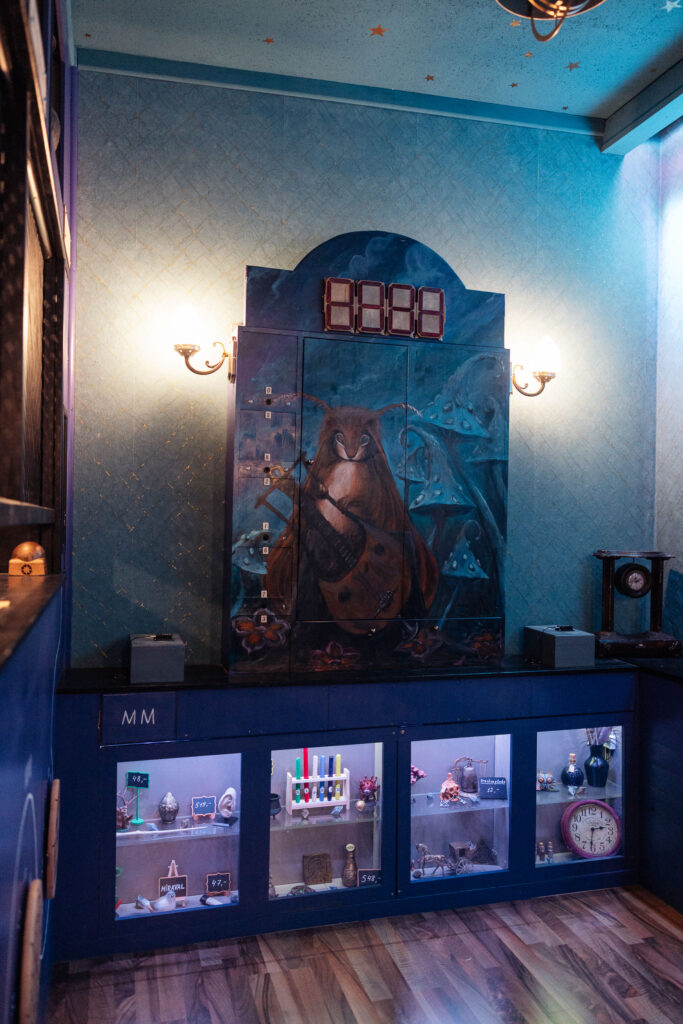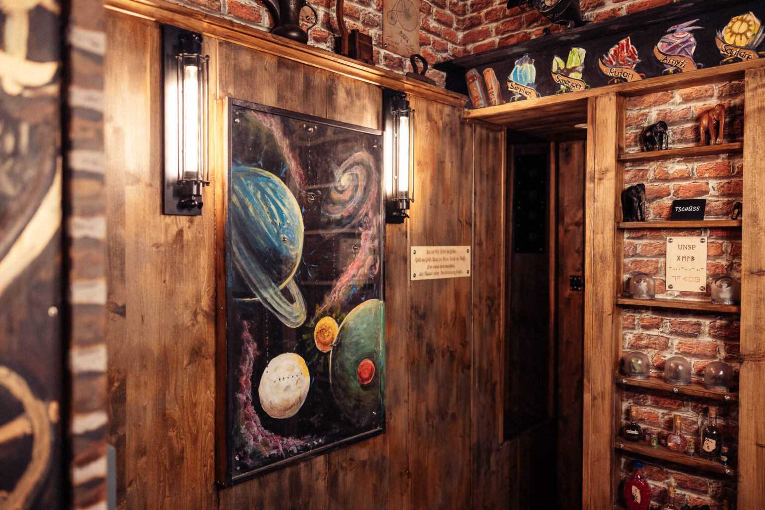 „Lehrer zeigen sich jetzt schon begeistert, da wir uns von der digitalen Welt entfernen und die Besucher mit Zettel, Stift, Zahlenschlössern oder einer knapp 70 Jahre alten Registrierkasse agieren lassen“, berichtet der gebürtige Ukrainer über die ersten Monate nach der Neueröffnung. „Bisher ist noch nichts kaputt gegangen, wobei wir aus früheren Erfahrungen mit den Escape Rooms schon alle Bilder fest an der Wand verschraubt haben“, führt Nicolai Bortmann freundlich aus. Eltern oder andere Begleitpersonen werden geschickt in den Prozess miteingebunden, falls kleinere Probleme auftauchen sollten: „Das hat auch eine psychologische Komponente, wenn die Kinder keine Fremden fragen müssen. Aber die machen das schon!“ Keine Frage, die urige Cornelius-Hütte, die geheimnisvolle Wilbur-Allee oder der magische Alchimisten-Shop mit beeindruckenden Deckenbildern des Krefelder Künstlerduos Tubuku stellen einen wohltuenden Kontrast zur technisierten Realität von heute dar. Moderne Technik wird dennoch eingesetzt, wennes sinnvoll ist: So können Termine wie Familienausflug oder Kindergeburtstag einfach online über die Webseite gebucht werden, und alle Räume der Spielwelt sind klimatisiert. Auch ganze Schulklassen sind willkommen und können Teamgeist, Fantasie und logisches Denken trainieren.