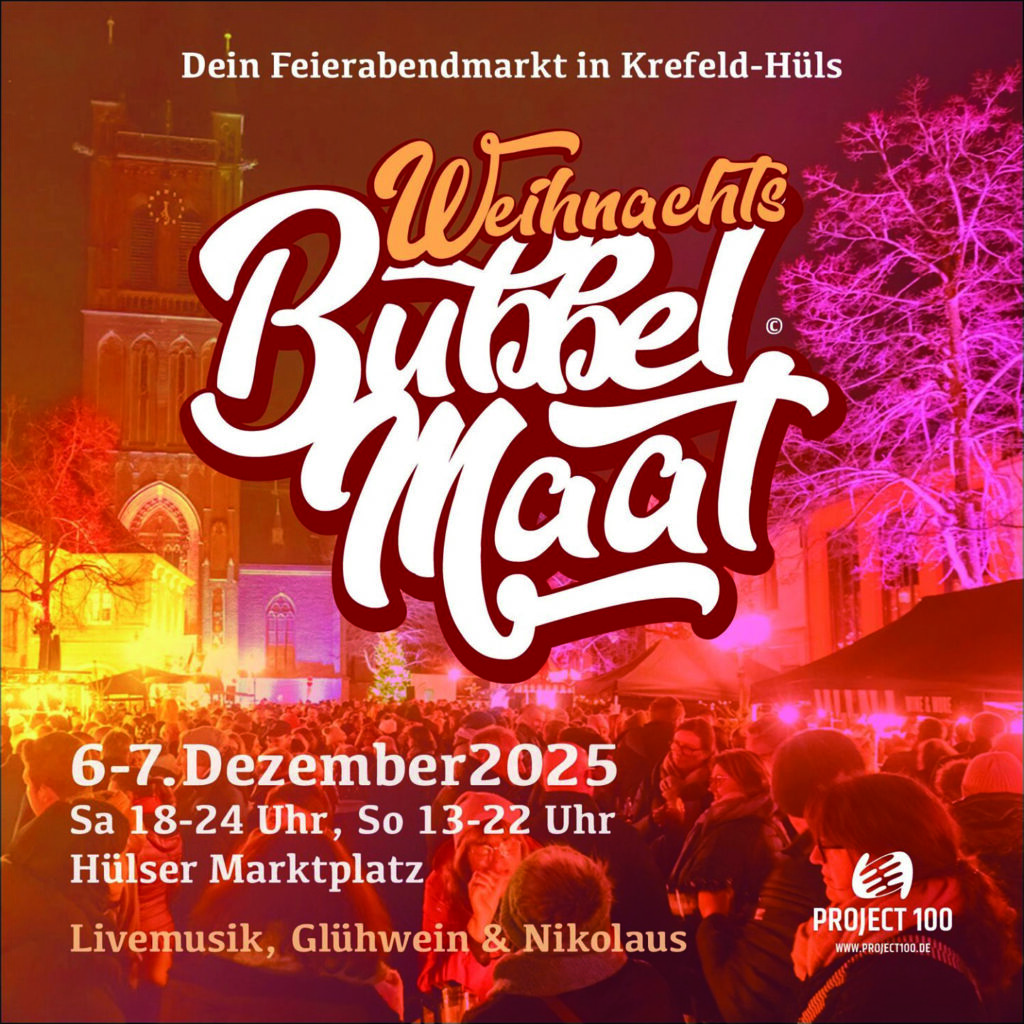 Der WeihnachtsBubbelmaat kehrt 2025 für zwei festliche Tage ins Hülser Zentrum zurück. Nach dem großen Erfolg im Vorjahr lädt das Bubbelmaat-Team am 6. und 7. Dezember zu einem Markt ein, der Musik, Genuss und Gemeinschaft verbindet. Der Samstag startet um 18 Uhr mit einer atmosphärischen Abendveranstaltung, bevor der Hülser Nikolaus den Markt offiziell um 18:45 eröffnet — begleitet vom traditionellen Weihnachtsbaumschmücken durch die Kinder. Ab 20 Uhr sorgt Florian Gallant aus „The Voice of Germany“ mit Band für Stimmung. Der Sonntag beginnt um 13 Uhr und bietet erstmals zusätzliche Verkaufsstände rund um die Kirche. Auf der Bühne spielt die KKG BigBand, gefolgt vom Kinderchor der Astrid-Lindgren-Grundschule und einer niederländischen Kapelle. Um 18 Uhr tritt der 40-köpfige Herrenchor „Die Bruchpiloten“ auf, bevor Livemusik den Abend bis 22 Uhr begleitet. Kulinarisch reicht das Angebot von Flammlachs über Reibekuchen bis zu Crêpes und Champignons. Für Kinder gibt es ein Tipi-Zelt mit Musik von Christoph „Stoffel“ Stirken sowie Karussells. Der WeihnachtsBubbelmaat verspricht erneut zwei Tage voller Lichterglanz und Vorfreude mitten in Hüls.