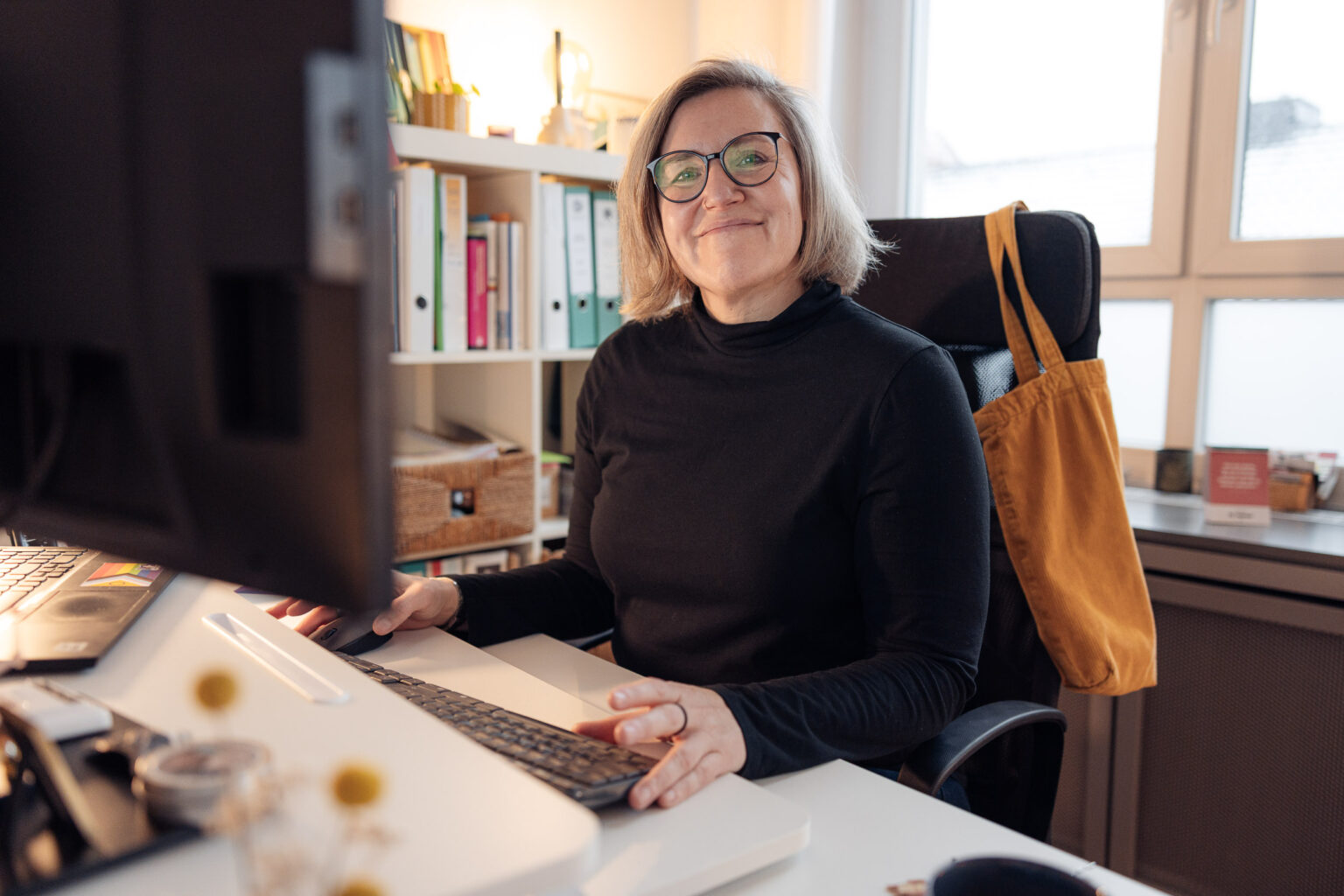 Aufgewachsen im Ruhrgebiet und aktive Basketballspielerin, seit sie elf Jahre alt ist, landet die mit 1,83 Metern groß gewachsene Frau über ihren Trainerjob bei der Jugendhilfe in Oberhausen. Ein Praktikum und ihre Erfahrungen aus dem Mannschaftssport lassen damals nur eine „logische“ Konsequenz für sie zu: ein Studium der Sozialpädagogik. „Ich war halt immer in soziale Gefüge eingebunden.“ Es folgen viele Berufsjahre in der Beratung von „verhaltensoriginellen“ Kindern und Familien. Doch irgendwann beschließt Tanja Heier, dass sie mit 40 nicht mehr „auf dem Bauteppich“ sitzen, sondern mehr mit Erwachsenen arbeiten möchte. Sie macht sich im Sommer 2016 auf den Jakobsweg, um neue Perspektiven und Klarheit zu finden – und muss als heute 47-Jährige selbst über das Klischee der suchenden Pilgerin schmunzeln. „Als ich mich anschließend bei der Frauenberatung in Krefeld bewarb und im Februar 2017 hier anfing, wusste ich gar nicht, was eigentlich alles dazu gehört“, gesteht die Wahl-Düsseldorferin. „Jetzt liebe ich diesen vielseitigen Mix aus Beratung, Vernetzung, Präventions- und Öffentlichkeitsarbeit sehr!“ Fördergelder beantragen, Kurse zur Selbstbehauptung organisieren oder auch mal Toilettenpapier beschaffen, nennt sie als Aufgaben, die es zu managen gebe. Dass ihr und dem Team die Arbeit ausgeht, ist angesichts der guten Auslastung – allein 1.343 Einzelberatungen im Jahr 2024 – und zunehmender Gewalt gegenüber Frauen und Mädchen unwahrscheinlich.