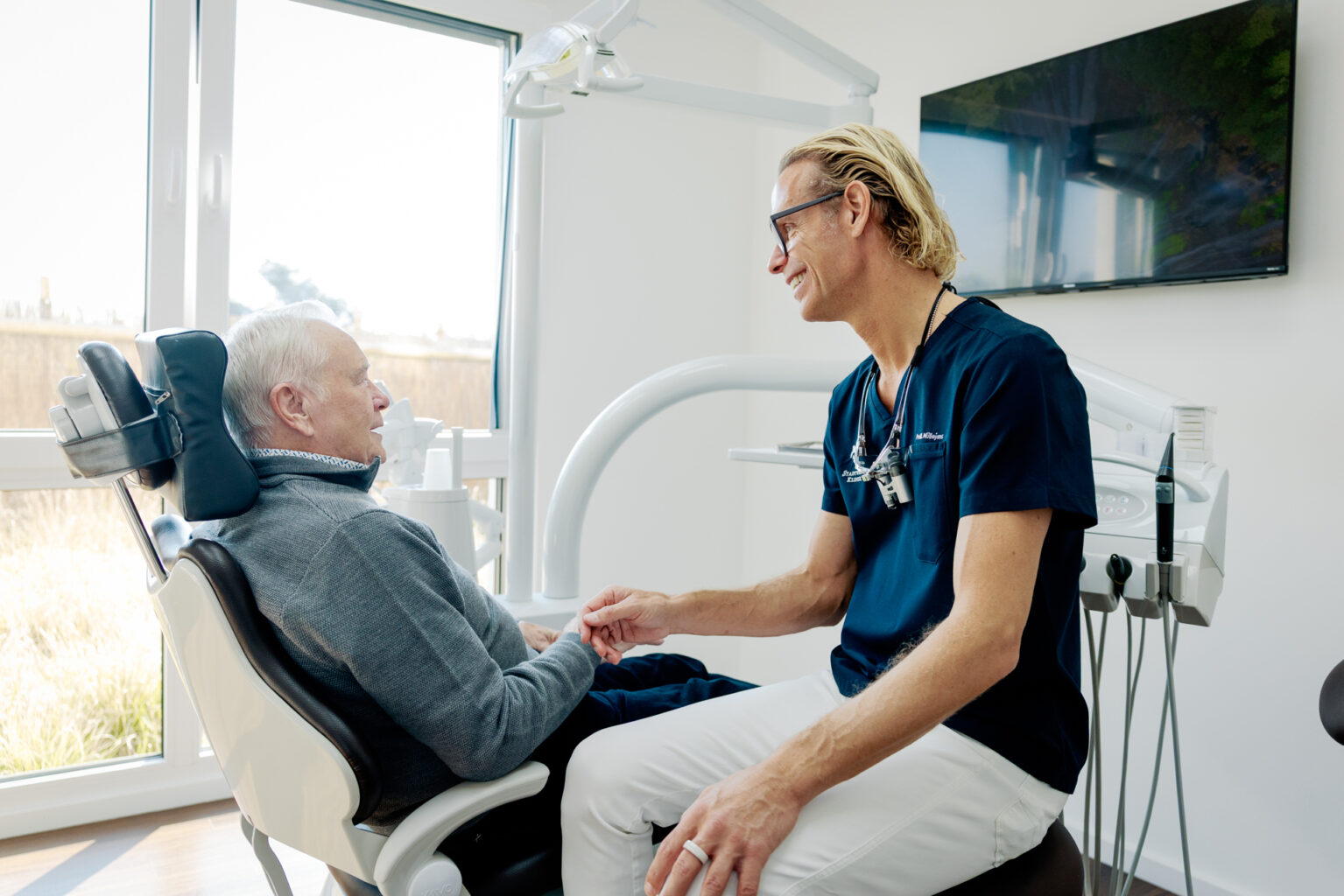 Als Zahnarzt und Chirurg mit über 30 Jahren Erfahrung in der Implantatversorgung kann Müllejans in der Stadtwald Klinik einen Service anbieten, der am Niederrhein so längst nicht selbstverständlich ist. Es gibt einen echten Klasse-1-OP-Saal mit angeschlossenem Aufwachraum, in dem Patienten nach der Behandlung in aller Ruhe zu sich kommen können. Der hochwertige Zahnersatz aus Kunststoff oder Keramik entsteht nach digitaler Planung im hauseigenen Dentallabor — perfekt für schnelle Anpassungen, Korrekturen oder auch eventuelle Reparaturarbeiten. „Unsere Zahntechniker werden von Anfang an mit eingebunden“, bestätigt Müllejans. „Versorgungen sollen nicht nur haltbar und funktional, sondern auch ästhetisch ansprechend sein. Unsere Patienten können sich die Zahnfarbe aussuchen und uns ihre Wünsche hinsichtlich der Zahnform mitteilen.“ Aspekte, mit denen sich viele noch nie beschäftigt haben. „Ich sage meinen Patienten immer, dass es jetzt einmal ganz und gar nur um sie geht. Und ich dafür da bin, ihnen ihre Wünsche zu erfüllen. Zähne machen so viel für unser Gesicht, unser Lächeln und unsere Ausstrahlung! Und wenn wir jetzt eh alles neu machen, warum dann nicht in schön?“, fragt Müllejans. Erich Blinten hat seine Entscheidung nicht bereut. Seinen Lebensabend kann er jetzt den angenehmen Dingen widmen, ohne sich mit seinen Zähnen herumärgern zu müssen. „Ich kann jedem nur empfehlen, die Stadtwald Klinik aufzusuchen und sich zu informieren!“, rührt er lachend die Werbetrommel wie ein Profi. Und dann lässt er sich das Gulasch mit Klößen schmecken, das seine Schwägerin ihm zubereitet hat. Wie sich das für ihn anfühlen muss, lässt sich von außen nur schwer nachvollziehen. Aber sein Gesicht zeigt das pure Glück.
