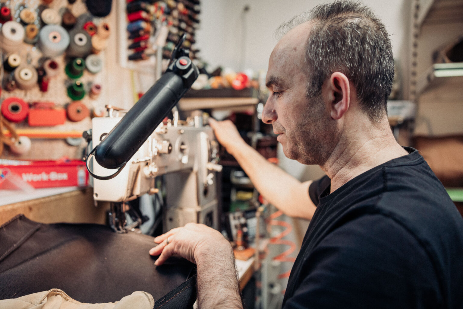 Dass der dreifache Familienvater mal als Täschner in Deutschland arbeiten würde, verdanke er im Grunde einer Reihe von Zufällen, taucht er bei einem Becher Kaffee in seine syrische Kindheit ein. „Ich bin nach der sechsten Klasse von der Schule abgegangen — das war nicht meins — und habe zunächst wie mein Bruder als Bauarbeiter gearbeitet. Eines Tages lernte ich auf einer Baustelle einen Schuhmacher kennen, der sah, wie präzise ich die Nägel einschlug. Er bot mir spontan eine Ausbildung an.“ M. Khir Hajou lässt sich im Alter von 15 Jahren auf das Abenteuer ein und lernt von der Pike auf, wie man mit Rohleder, Mustern oder Leisten umgeht. Dabei kann es auch vorkommen, dass er ins 500 Kilometer entfernte Aleppo geschickt wird, um Material zu besorgen. Was ihn bis heute spürbar fasziniert, sind die Maschinen, die er auseinandernimmt, säubert und schärft – Augenmaß und Sorgfalt zählen definitiv zu seinen Stärken. Die jetzige Werkstatt steht voll mit Nähmaschinen von Dürkopp, Singer und Adler, das massive Presswerk mussten fünf Männer ins Geschäft hineintragen. „Viele Maschinen begleiten mich seit Bayern“, erzählt er von seinen Anfängen in Deutschland. Die Jobsuche erwies sich trotz des Meisterbriefs als schwierig, er fängt als einfacher Leiharbeiter in einer bayrischen Schuhfabrik an und stellt nach gut zwei Jahren den Chef vor die Wahl: „Entweder ich habe bis 12 Uhr einen richtigen Vertrag oder ich bin nach der Mittagspause weg!“ Weil das Dokument pünktlich geliefert wird, bleibt er noch viele Jahre in Süddeutschland; Hartnäckigkeit gepaart mit ausgeprägter Berufsehre führen ihn regelmäßig ans Ziel. Nach der Trennung von seiner damaligen Lebensgefährtin landet er über Umwege in Willich-Schiefbahn bei einem Orthopädie-Schuhmacher, bis er 2019 die Chance ergreift, sich selbstständig zu machen. „Mittlerweile arbeite ich zudem drei Tage die Woche bei Reitstiefel Kempkens“, lässt der Inhaber durchblicken, dass die Zeiten nicht ganz so rosig sind. Er wird dann vertreten von Ehefrau Faeza, die genauso charmant im Laden agiert.
