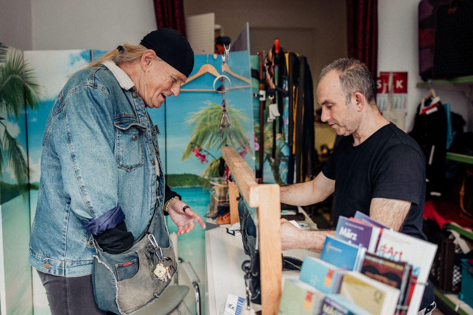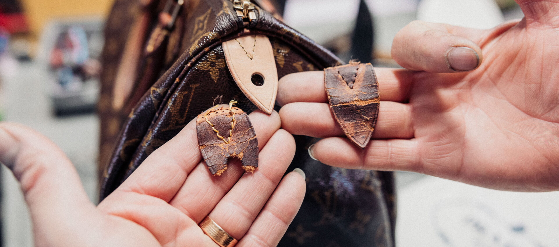 „Meine Kunden kommen nicht nur aus Krefeld, sondern auch aus Neuss, Düsseldorf oder Duisburg“, freut sich der gelernte Schuhmacher über die überregionale Nachfrage. „Die Menschen haben ein individuelles Problem mit einem Lederprodukt, das offensichtlich niemand anders lösen kann.“ Gerade erst habe er einen neuen Druckknopf an einem Lederarmband mit Schalke-04-Logo angebracht. „Supergut“ lobte nicht nur der Klient, die Zufriedenheit mit dem Ergebnis steht auch dem 58-jährigen Problemlöser quer ins Gesichtgeschrieben. „Schau mal hier, diese alte Lederjacke – den Riss im Rücken verdecke ich mit zwei dekorativen Flicken, dann kommt noch eine Schönheitsnaht daran.“ Seine Augen leuchten. Ob Vintage-Designer-Handtasche, Motorradjacke, Rucksack oder Möbelstück aus der Arztpraxis – zu jedem Auftrag gibt es vorab eine patente Beratung, was machbar ist und wie hoch die Kosten ausfallen werden.„Wenn jemand mit einem billigen Produkt in den Laden kommt, das bei einer chinesischen Plattform erworben wurde, übersteigen meine Reparaturkosten den ursprünglichen Warenwert oft deutlich“, erinnert M. Khir Hajou an die Grenzen seines Handwerks. Er versuche zwar immer, die Dinge am Leben zu erhalten und schöner zu machen. Wenn aber am Ende die Ware nicht abgeholt werde, sei das „schon frustrierend“, weist der Handwerker auf volle Regale mit reparierten Taschen und Koffern. Am meisten habe jedoch der Corona-Lockdown nur ein Jahr nach der Übernahme des Geschäfts geschmerzt: „Das war der Horror – nicht nur finanziell, sondern weil ich meinen Beruf so liebe!“ Um diese Zeit sinnvoll zu füllen, fertigte er Leisten für Mini-Schuhe und kleine Stiefel als Schlüsselanhänger.